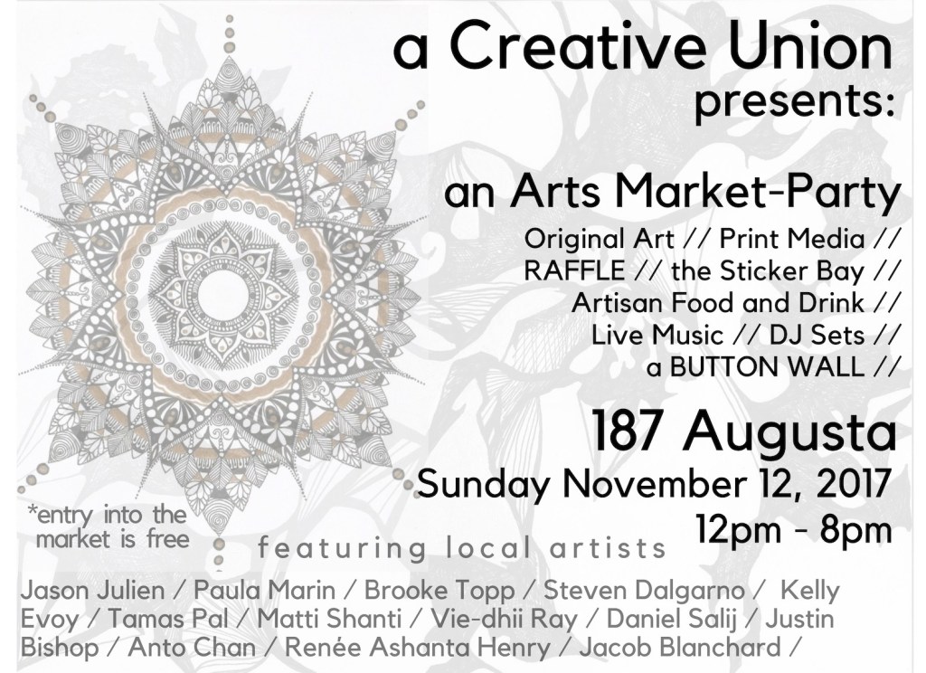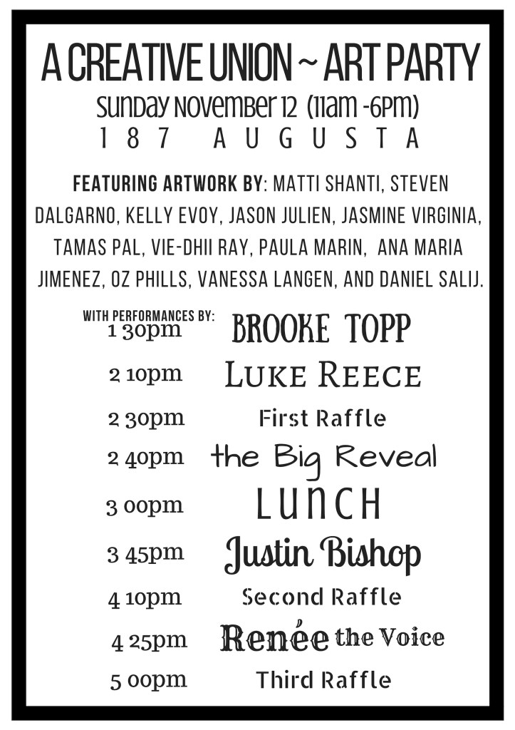 Art Everywhere was a party I hosted @ 187 in Kensington Market in the Fall of 2017. It was the first of it’s kind and was intended to celebrate art, creativity, and the coming together of good people. It included an array of visual arts and musical performances by some of my favourite people.